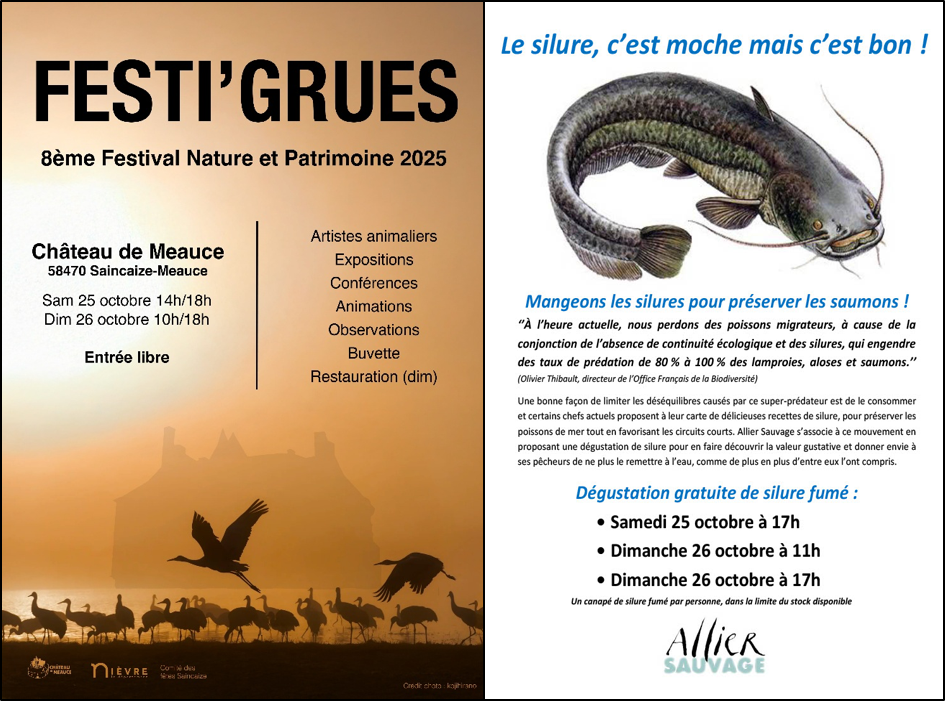 En dépit du temps maussade de ce week-end des 25 et 26 octobre la 8ème édition du Festi’Gruesaura été un succès auquel Allier Sauvage a contribué en créant la surprise au slogan de ‘’Le silure, c’est moche, mais c’est bon !’’. C’est dans le cadre somptueux du château de Meauce en bord d’Allier, que ce festival passionnant et bien organisé accueillait divers associations et artistes engagés dans la préservation de la nature et proposait un programme varié de conférences. Notre association y a une nouvelle fois partagé le stand des Amis du Val d’Allier, en proposant une dégustation de silure fumé à des visiteurs souvent surpris et largement conquis. Une occasion de discuter du grave problème posé avec l’envahissement de l’Allier par des silures de plus en plus gros, exerçant une prédation catastrophique sur les poissons migrateurs, comme le président d’Allier Sauvage l’a expliqué au cours d’une conférence sur ‘’Poissons migrateurs et silures’’.